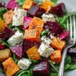This Creamy Roasted Beet Salad with Sweet Potato & Feta combines tender caramelized root vegetables with a tangy, creamy yogurt dressing, topped with crunchy toasted nuts and fresh greens. It’s a vibrant, nutritious salad perfect as a light meal or side dish.